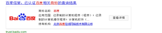 觸發(fā)機制:無論搜索任何關(guān)鍵詞,只要通過商標(biāo)認證的網(wǎng)址,被檢索出現(xiàn)在百度搜索結(jié)果中,都會展現(xiàn)藍色?標(biāo)。