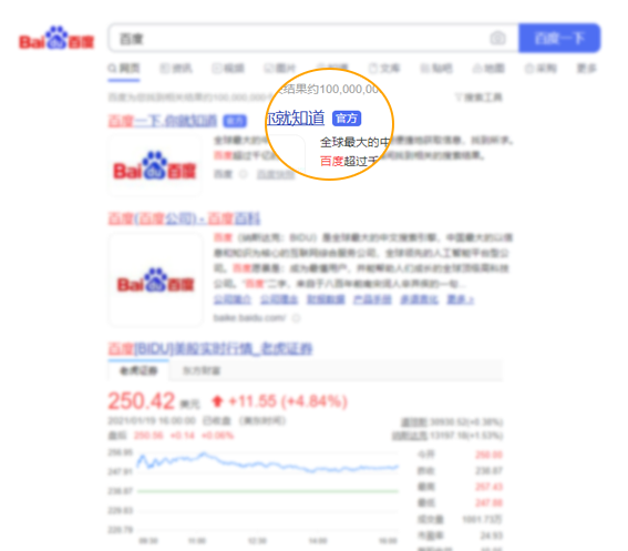 高級版觸發(fā)詞審核通過并生效后,當(dāng)網(wǎng)民精確搜索該觸發(fā)詞時,若認證通過的精確網(wǎng)址出現(xiàn)在搜索結(jié)果中,將為其展現(xiàn)藍色“官方”標(biāo)識。