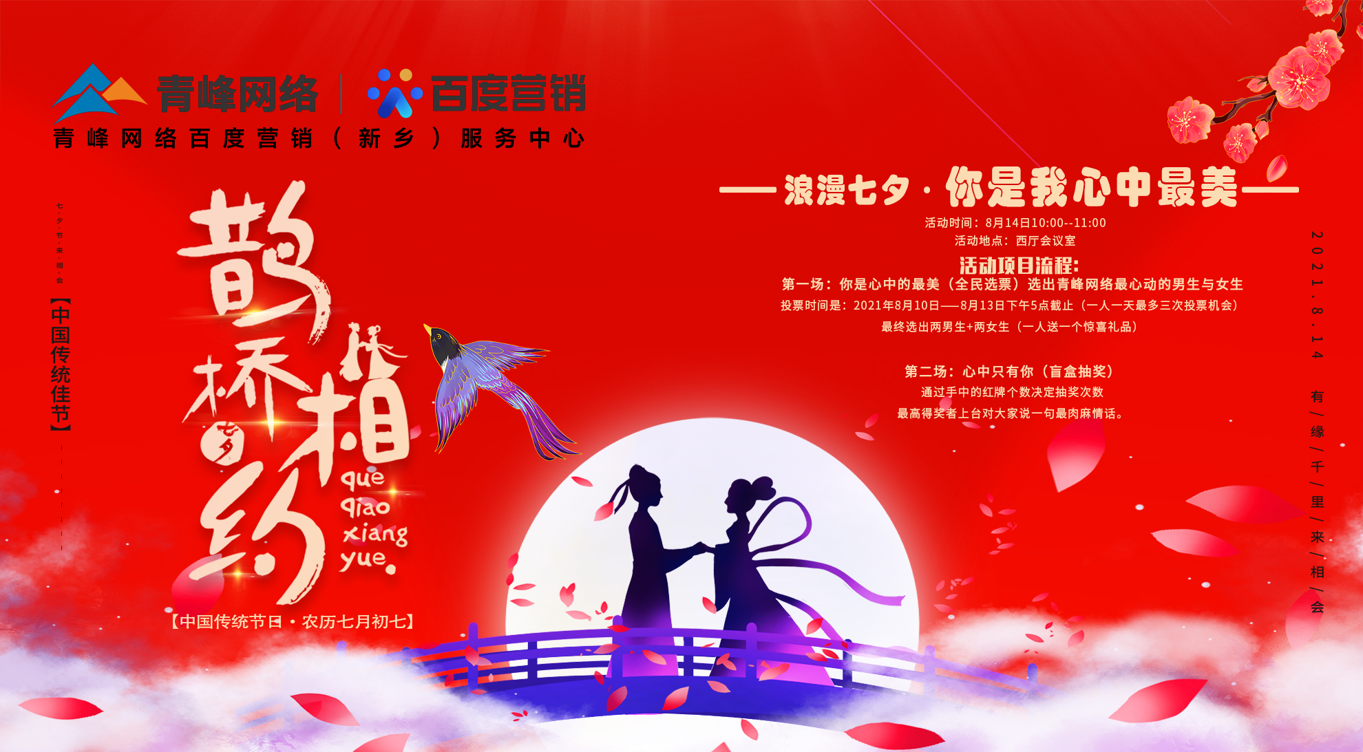 七夕佳節(jié)到來之際,青峰網(wǎng)絡(luò)舉辦“你是我心中最美”的投票征集活動(dòng),人人參與,人人有機(jī)會(huì)。