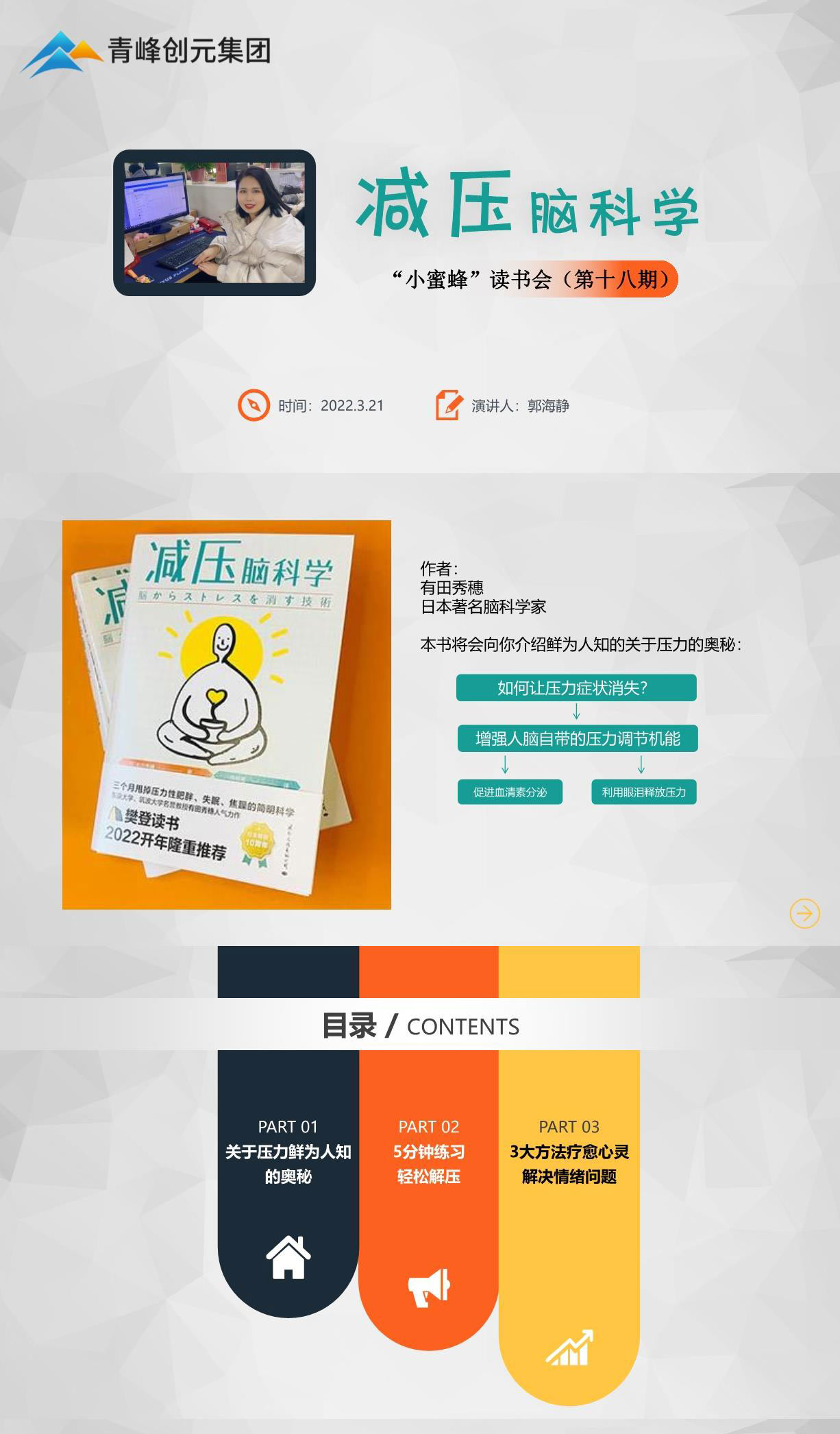 【青峰創(chuàng)元集團】“小蜜蜂”讀書會第十八期:《減壓腦科學(xué)》---郭海靜分享