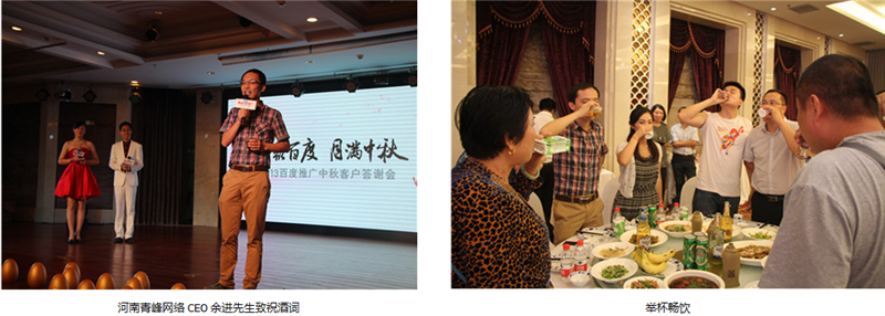 一杯杯酒,一首首歌,道不盡的問候,送不完的祝福,在這收獲的季節(jié),讓我們共同舉杯,祝福彼此。通過本次答謝會,進(jìn)一步溝通了客服人員與客戶的感情,也更加鞏固了百度推廣在客戶心中的品牌形象,堅定了他們與百度攜手,從一個成功走向另一個成功的信心!