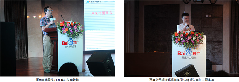 蒞臨本次答謝會現(xiàn)場的領(lǐng)導(dǎo)有:百度公司渠道部渠道經(jīng)理宋鋒輝先生,百度公司業(yè)務(wù)運(yùn)營部區(qū)域經(jīng)理何蓓女士,河南青峰網(wǎng)絡(luò)科技有限公司CEO 余進(jìn)先生。會議前半場,青峰網(wǎng)絡(luò)CEO余進(jìn)先生致開場詞,并帶來了《未來撲面而來》的精彩演講,帶領(lǐng)與會嘉賓一起回顧了互聯(lián)網(wǎng)發(fā)展的潮流,并以自己多年互聯(lián)網(wǎng)從業(yè)經(jīng)驗,預(yù)測未來互聯(lián)網(wǎng)發(fā)展的趨勢,引得臺下陣陣掌聲。接下來,由百度公司渠道部渠道經(jīng)理宋鋒輝先生帶來主題演講,宋經(jīng)理向到場的嘉賓介紹了百度2013年在各領(lǐng)域取得的巨大成就,并著重介紹了百度推廣新推出的品牌起跑線、問答營銷、企業(yè)之窗等新產(chǎn)品,擴(kuò)大了客戶網(wǎng)絡(luò)營銷的視野,堅定了與會嘉賓與百度推廣一起成長的信心。