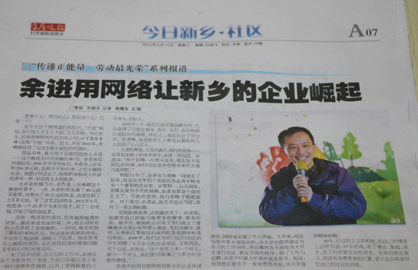 五月十五日,新鄉(xiāng)《平原晚報(bào)》,發(fā)表了新鄉(xiāng)市“五一”勞動(dòng)獎(jiǎng)?wù)芦@得者:河南青峰網(wǎng)絡(luò)科技有限公司總經(jīng)理余進(jìn)的專(zhuān)訪文章:余進(jìn)用網(wǎng)絡(luò)讓新鄉(xiāng)企業(yè)崛起。