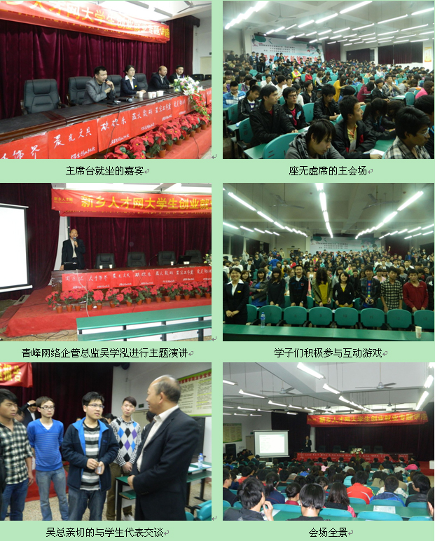 2012年4月19日,由新鄉(xiāng)人才網(wǎng)與新鄉(xiāng)青峰網(wǎng)絡(luò)聯(lián)合舉辦的校園巡講在新鄉(xiāng)技師學(xué)院拉開帷幕,本次巡講由新鄉(xiāng)青峰網(wǎng)絡(luò)企管總監(jiān)吳學(xué)泓先生、新鄉(xiāng)人才網(wǎng)市場部經(jīng)理陳永先生、開元明都大酒店人力資源部總監(jiān)王彩賢女士擔(dān)任主講,新鄉(xiāng)青峰網(wǎng)絡(luò)企管總監(jiān)吳學(xué)泓為這些莘莘學(xué)子講解了如何從校園到職場的華麗轉(zhuǎn)身,從九個方面闡述了擇業(yè)、就業(yè)、發(fā)展對人生的意義,它們分別是:一、認識形勢與認識自己 二、遠大理想與腳踏實地 三、找工作與找對象 四、價值與使用價值 五、就業(yè)與擇業(yè) 六、博學(xué)與專業(yè) 七、知識與經(jīng)驗 八、付出與回報 九、堅持與轉(zhuǎn)變。